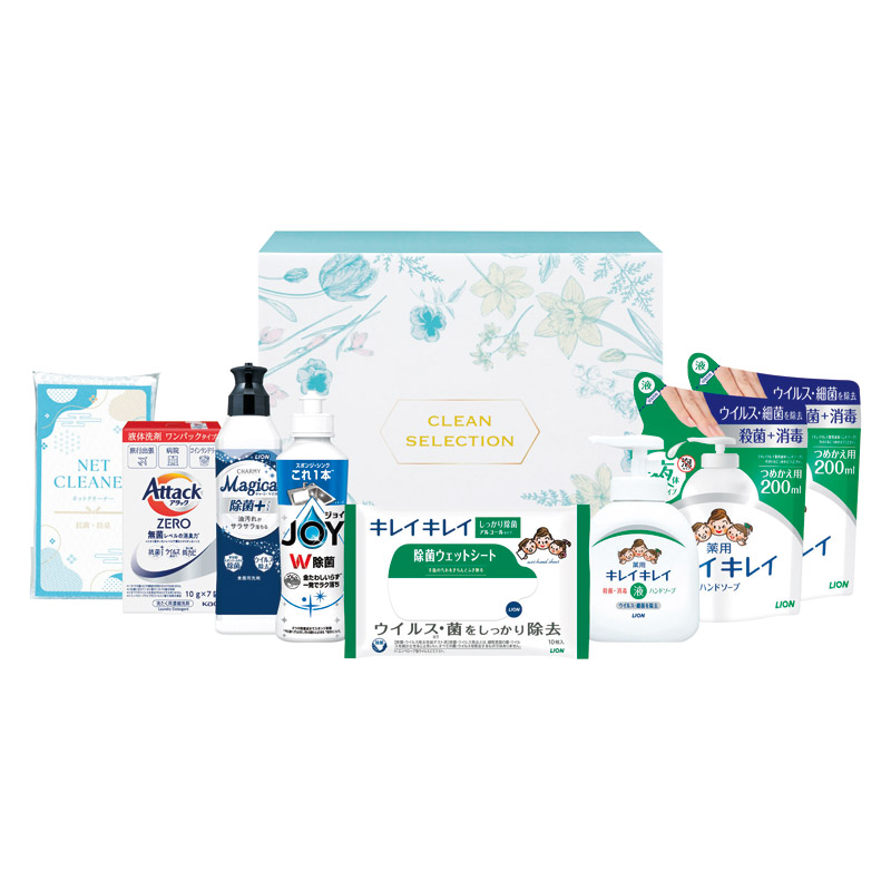 | 内容 | ライオンキレイキレイ薬用液体ハンドソープ(250ml)・ライオンキレイキレイ除菌ウェットシート(アルコールタイプ)(10枚)・P&G除菌ジョイコンパクト(170ml)・ライオンマジカ除菌プラス(220ml)・花王アタックZEROワンパック(7P)・ネットクリーナー(1P)×各1、ライオンキレイキレイ薬用液体ハンドソープ詰め替え(200ml)×2 |