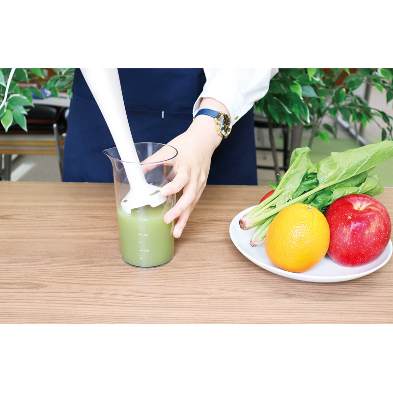 | コピー | 「つぶす」「混ぜる」がかんたん&スピーディー。握りやすい持ち手、扱いやすいスティック型。ワンタッチで切り換え可能な2段階スピード。容器をキズつけにくいプラスチック型ガード。 |