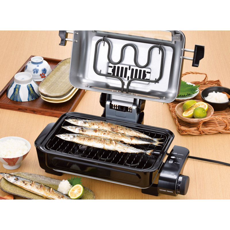 | コピー | さんま4匹が焼けるフィッシュロースター。●裏返し不要の上下ヒーター●焼き網の裏表で高さを変えられる●ニオイを軽減、消臭フィルター付き●30分まで対応可能なタイマー機能●分解できて水洗いOK(ヒーター部除く) |