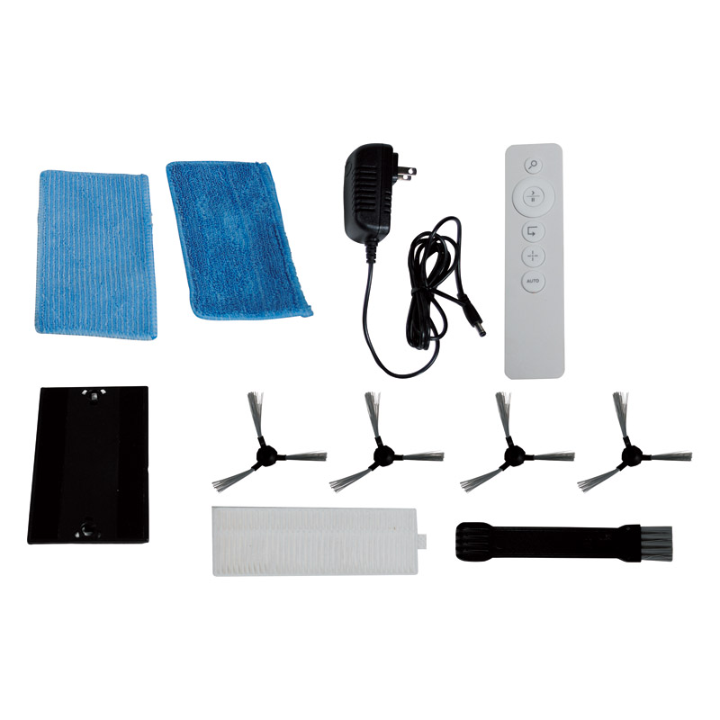 | 内容 | 本体(約290×290×76㎜)・ACアダプター・フロアーモップホルダー・お手入れブラシ・リモコン×各1、集塵フィルター・サイドブラシ(右・左)・フロアモップシート×各2 |