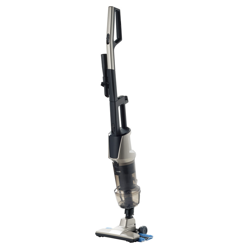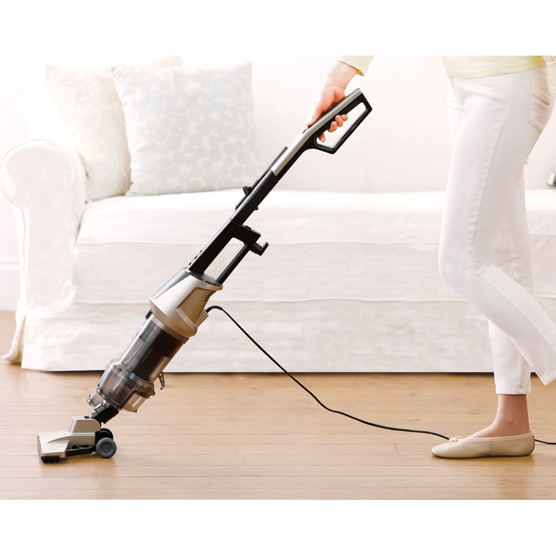 | コピー | 吸い込みながら拭き掃除も同時にできるワイパー付。高速遠心分離サイクロンで吸込力持続かつ紙パック不要。ハンディでもスティックでも手元で操作可能。●集塵容量:約900ml |