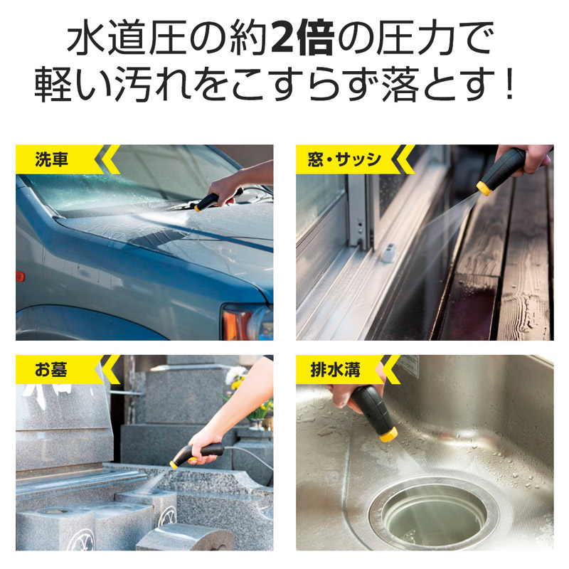 | 内容 | 本体(約298×305×271㎜)・トリガーガン・フレックスホース(1.8m)・フラットジェットノズル・充電USBケーブル(タイプC)・充電アダプター×各1 |