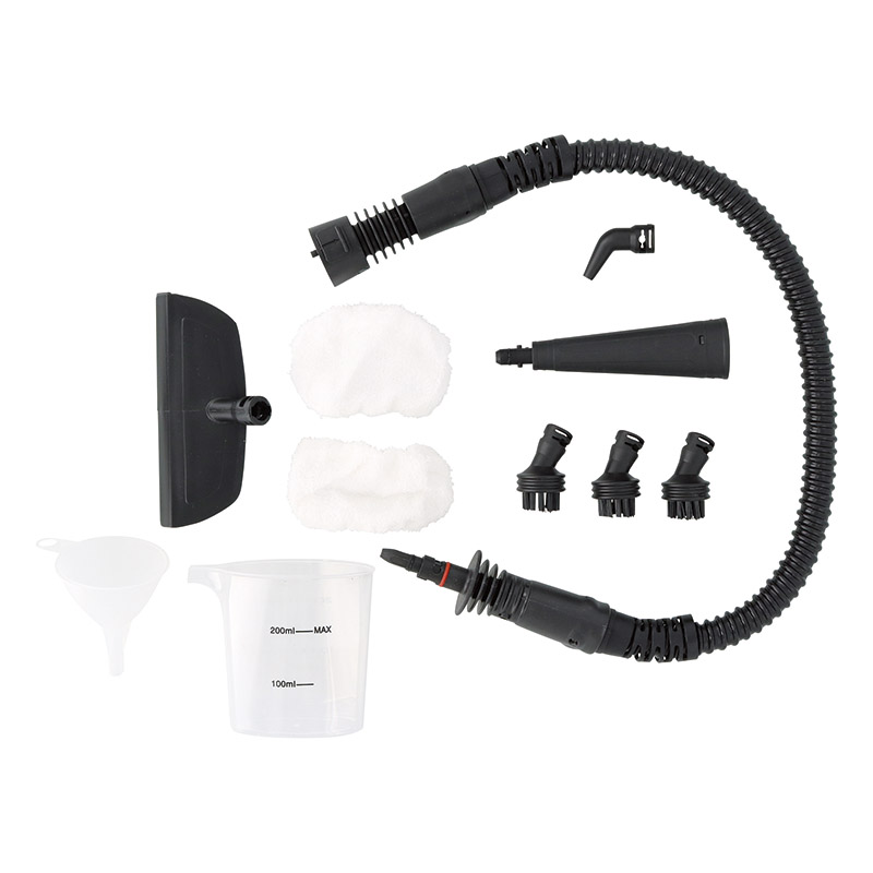 | 内容 | 本体(約115×265×207㎜)・ストレートノズル・延長ホース・アングルノズル・窓用アタッチメント・ジョウゴ・メジャーカップ×各1、ブラシ×3、布カバー×2 |