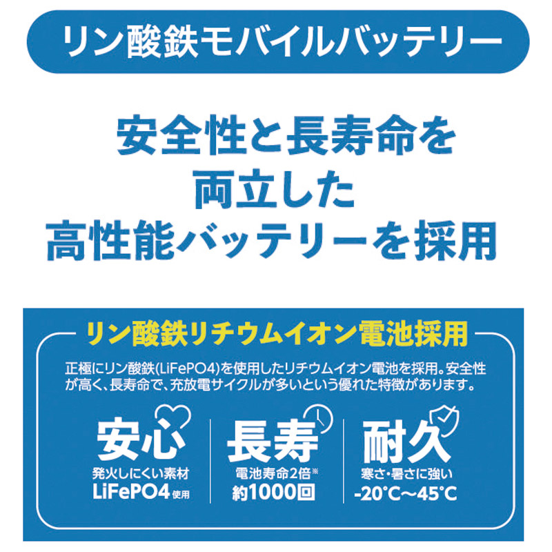 | コピー | リン酸鉄リチウムイオン電池採用のモバイルバッテリーです。発火しにくい素材LiFePO4を使用しているため安心安全です。電池寿命は一般的なモバイルバッテリーに比べ2倍の約1000回充放電が可能です。耐久環境では-20℃~45℃と寒さに強いです。 |