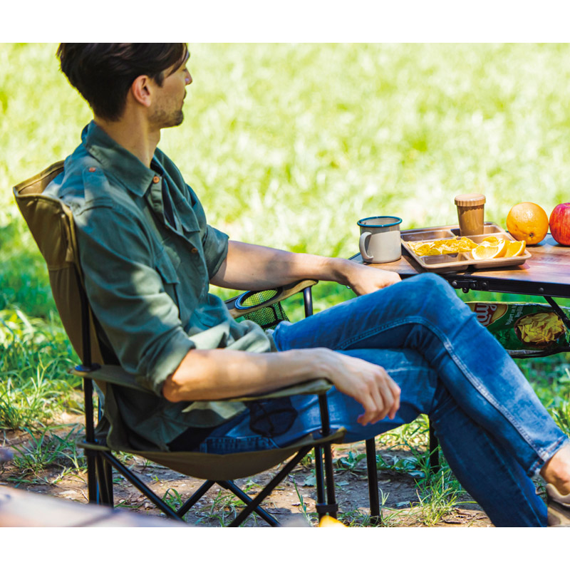 | コピー | 背もたれの角度にこだわった、ゆったり座れる広座面設計のハイタイプキャンプチェア。ひじ掛けにはドリンクホルダー2個とスマホホルダー付き。耐荷重:約120㎏ |
