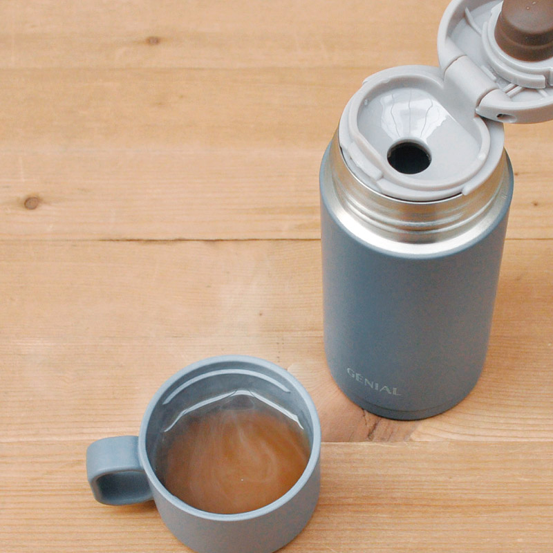 ポケットに入れて持ち運べる小さい保冷保温ボトル。フタがコップになっているから、熱々の飲み物も冷ましながらゆっくりと楽しめます。