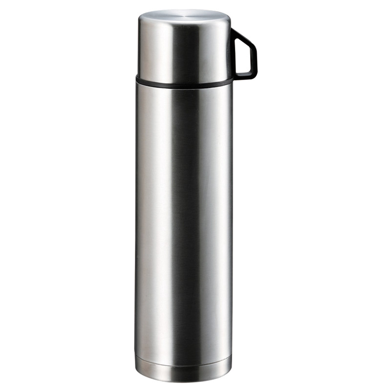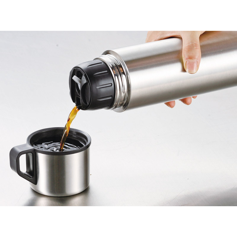 注ぎやすいワンタッチボタン。持ちやすいマグカップタイプの蓋付ステンレスボトルです。