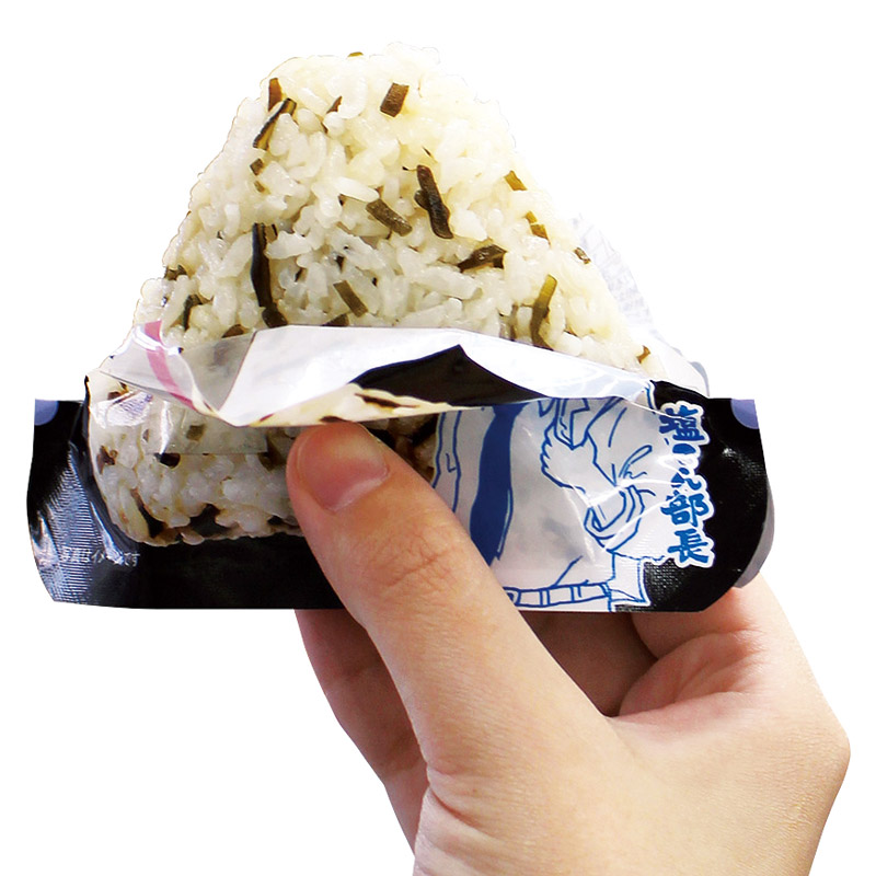 「お湯」または「水」を入れるだけで、具材の旨みがギュッと詰まったおいしい三角形のおにぎりが出来上がります。手を汚さずに食べられる3点カット方式。
