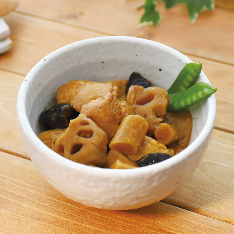 鶏むね肉とごぼう・れんこん・しいたけを醤油ベースの味付けで仕上げました。