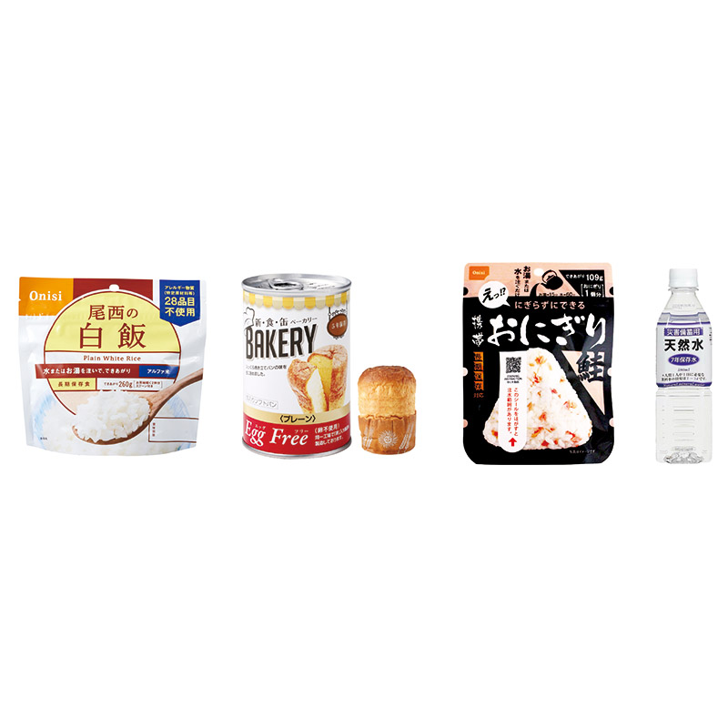 | 内容 | 尾西の白飯(アルファ米)・AST新・食・缶ベーカリー(プレーン)・尾西の携帯おにぎり(鮭)・災害備蓄用天然水500ml 7年保存 |