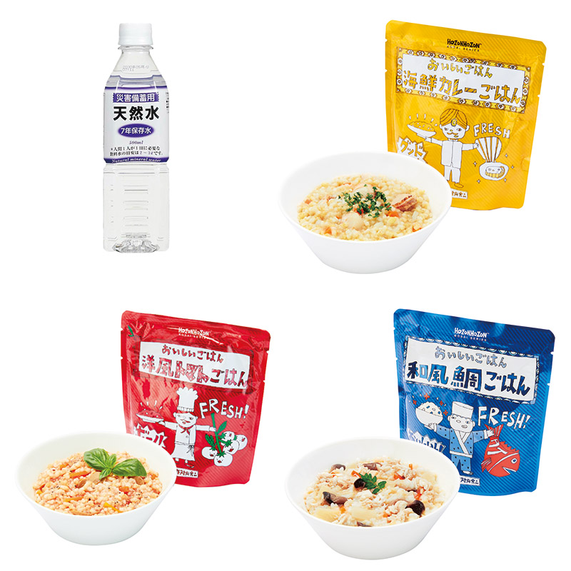 | 内容 | HOZONHOZON BOSAISERIES おいしいごはん「洋風トマトごはん」「和風鯛ごはん」「海鮮カレーごはん」・災害備蓄用天然水500ml 7年保存 |