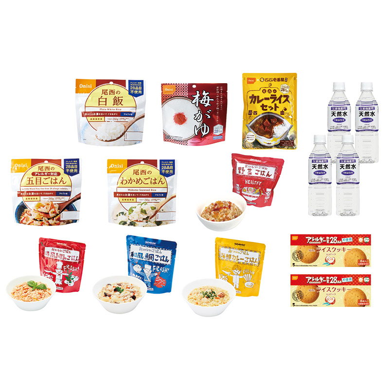 | 内容 | 尾西の白飯(アルファ米)・尾西の梅がゆ(アルファ米)・尾西のわかめごはん(アルファ米)・尾西のアレルギー対応五目ごはん(アルファ米)・CoCo壱番屋監修 尾西のカレーライスセット・HOZONHOZON BOSAISERIES おいしいごはん「洋風トマトごはん」「野菜ごはん」「和風鯛ごはん」「海鮮カレーごはん」・尾西のライスクッキー ココナッツ×2・災害備蓄用天然水500ml 7年保存×4 |