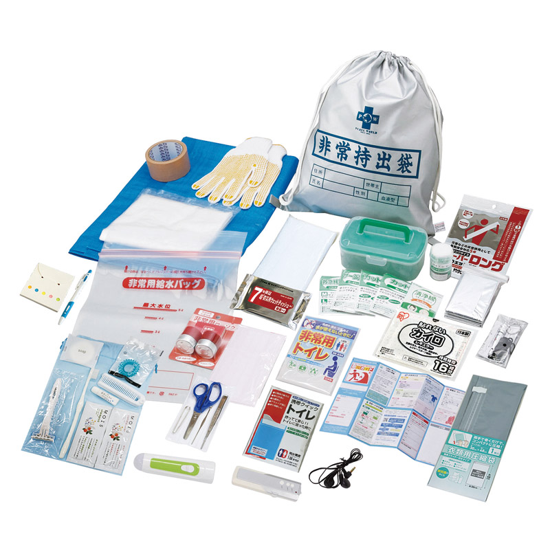 | 内容 | 難燃性非常袋(約445×385㎜)×1、非常用給水バッグ(5㍑)・ハンディライト・コンパクトFMラジオ・すべり止め手袋・防寒シート・非常用トイレ・カイロ・マスク・携帯トイレ(小)・緊急用ホイッスル・ゴミ袋(45㍑10枚入)・防災用ウエットティッシュ(20枚)・ブルーシート(2畳用)・布テープ・非常用ローソクセット・ウエットボティタオル・救急箱・カット綿(3枚)・カットガーゼ(3枚)・包帯・救急絆創膏(2サイズ×3)・サージカルテープ・清浄綿(2サイズ×3包)・ハサミ・ピンセット・耳かき・毛抜き・宿泊セット用ポーチ・カミソリ・ハブラシセット・コンパクトブラシ・シャンプー&コンディショナー・石鹸・タオル・ヘアーバンド・圧縮袋・ふせんメモセット・ボールペン・防災ガイド×各1 |