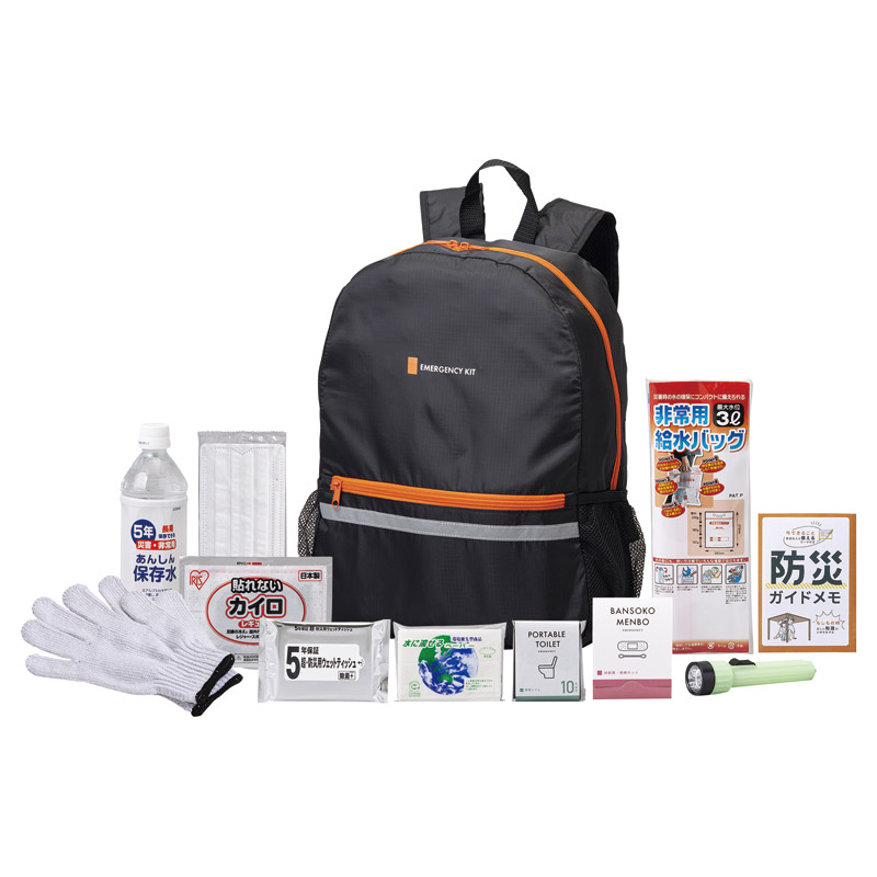 | 内容 | エマージェンシーリュック(約400×330×120㎜)×1、水に流せるポケットティッシュ・携帯トイレ(1回分)・使い捨てカイロ・使い捨てマスク・防災ガイドメモ・蓄光LEDライト・保存水(約500ml)・軍手・非常用給水バッグ(3㍑)・絆創膏&綿棒セット・ウェットティッシュ(5年保存)×各1 |