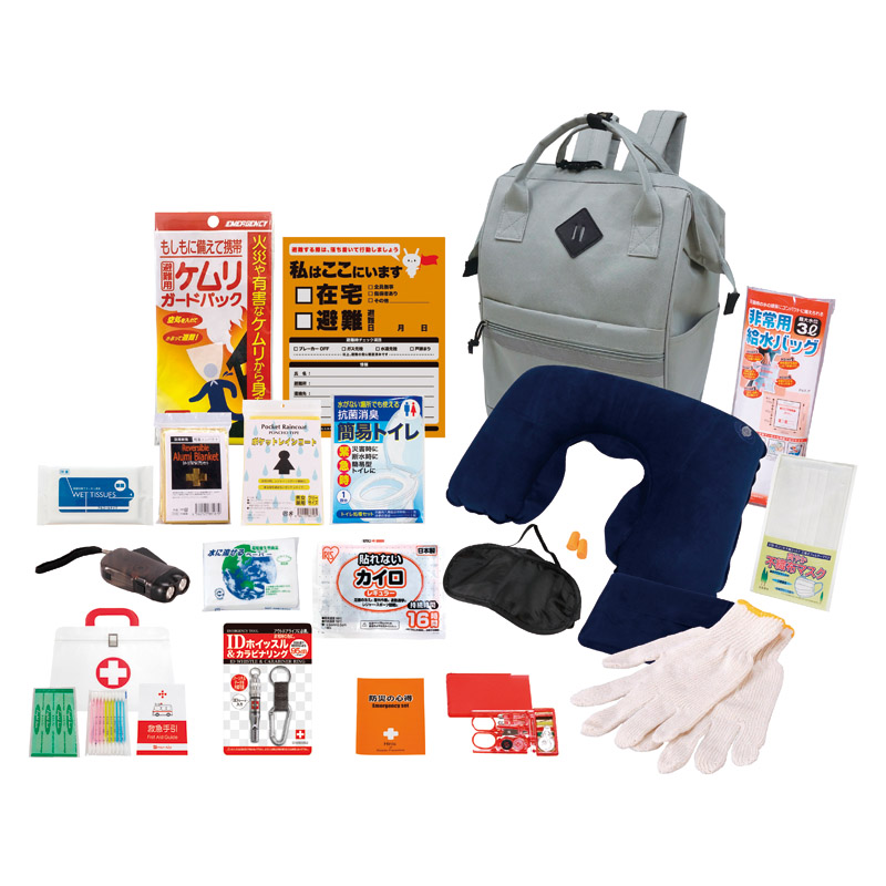 | 内容 | 収納リュック(約190×290×360㎜)×1、防災の心得・IDホイッスル&カラビナリング・カイロ・レインコート・抗菌消臭簡易トイレ・ダイナモLEDライト・軍手・アルミブランケット・マスク・アイマスク・耳栓・ネックピロー・避難用ヘッドカバー・給水袋(3㍑)・ソーイングセット・緊急避難カード・除菌アルコールウェットティッシュ・水に流せるペーパー・救急4点セット×各1 |