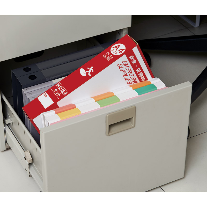 | コピー | 地震・災害などにより急いで避難を要する際に、避難場所までの移動を素早く行う為、最低限必要と思われる防災グッズをセットした避難セット。 |