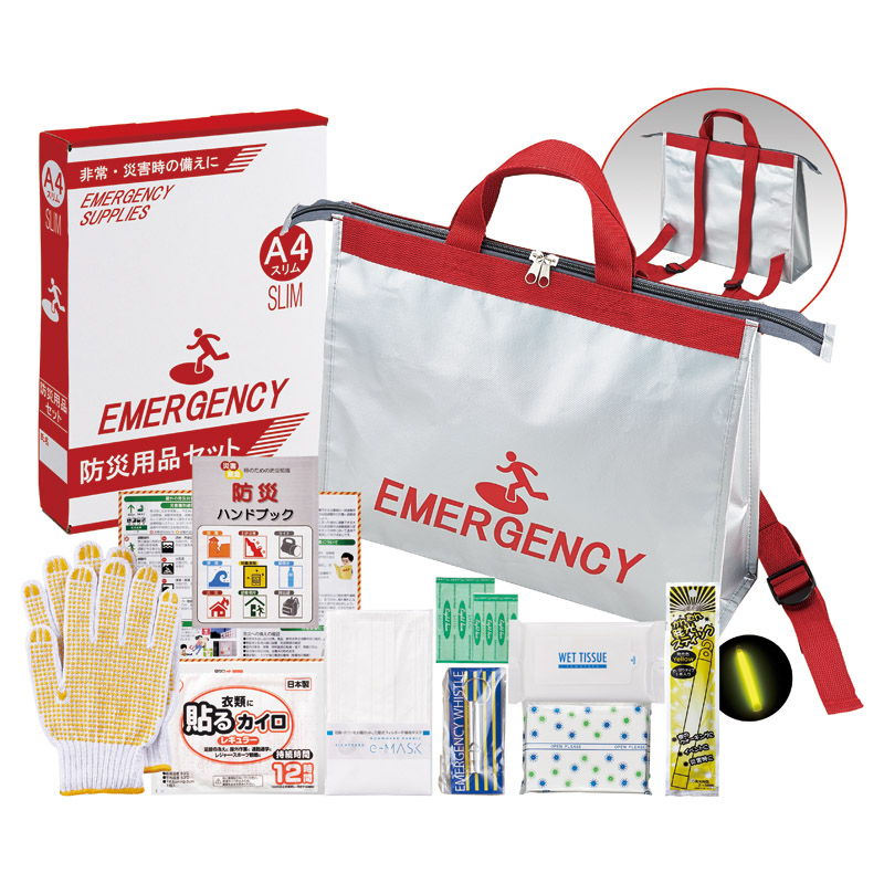 | 内容 | トートリュックバッグ(約100×370×295㎜)×1、発光スティックライト・ウェットティッシュ(10枚)・ポケットティッシュ・防災ハンドブック・軍手・エイトバン(大小×各2)・使い捨てカイロ・マスク・ホイッスル×各1 |