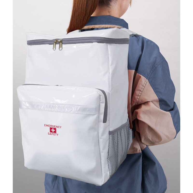 | 内容 | ターポリンリュックバッグ(約200×300×450㎜)×1、キャリーカート・COB伸縮2WAYライト・ホイッスル・防災手帳(ハンドブック・IDカード付)・防寒アルミシート・ウェットティッシュ(20枚)・ペーパー歯磨き(5包入)・軍手・レインコート・エイトバン(大小×各2)・非常用ウェットタオル・マスク・首枕・アイマスク・耳栓・スリッパ・給水袋(3㍑)×各1、ライスクッキー×2、携帯トイレ(大小兼用)(2P)・使い捨てカイロ・備蓄用飲料水(500ml)・ポケットティッシュ×各3 |
