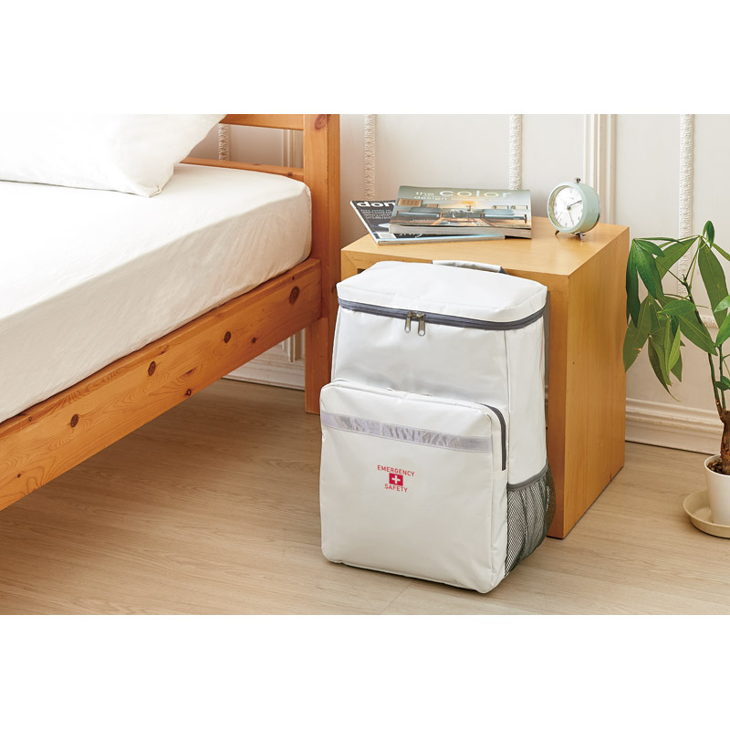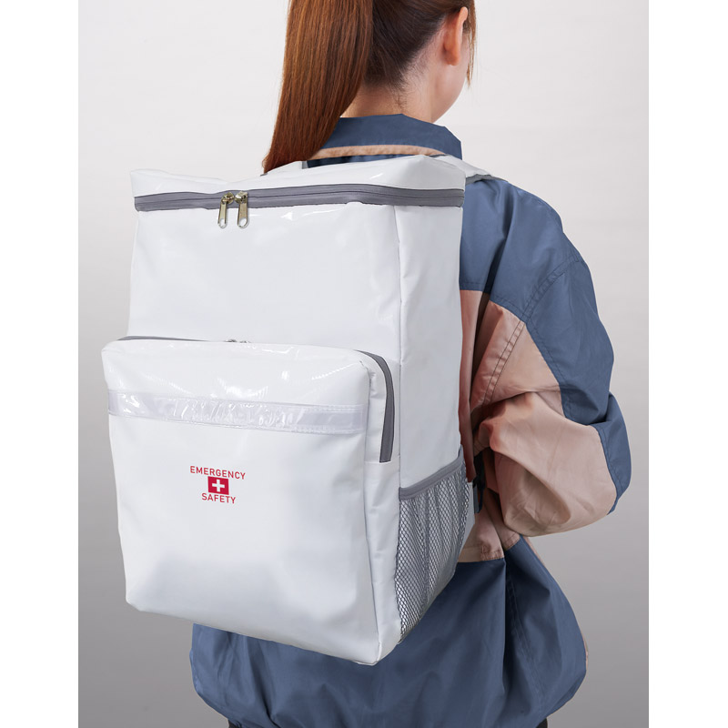 | 内容 | ターポリンリュックバッグ(約200×300×450㎜)×1、キャリーカート・ダイナモエマージェンシーライト・ホイッスル・防災ハンドブック・防寒アルミシート・ペーパー歯磨き(5包入)・軍手・レインコート・エイトバン(大小×各2)・非常用ウェットタオル・サコッシュバッグ・医事管理ファイル・9光ライト・モバイルチャージャー(乾電池式)・首枕・アイマスク・耳栓・スリッパ・ミニランタン・ライスクッキー・携帯おにぎり(鮭)・携帯おにぎり(昆布)・給水袋(3㍑)×各1、携帯トイレ1日用(6回分)・ウェットティッシュ(20枚)・使い捨てカイロ・マスク×各2、備蓄用飲料水(500ml)×3、ポケットティッシュ×5 |