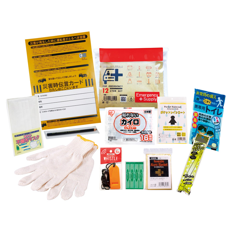 | 内容 | 防水ケース(約195×233㎜)×1、ホイッスル・マスク・カイロ・リバーシブルアルミブランケット・発光スティック・軍手・携帯用トイレ・レインコート・絆創膏(5P)・ダーマト鉛筆・災害時伝言カード×各1 |
