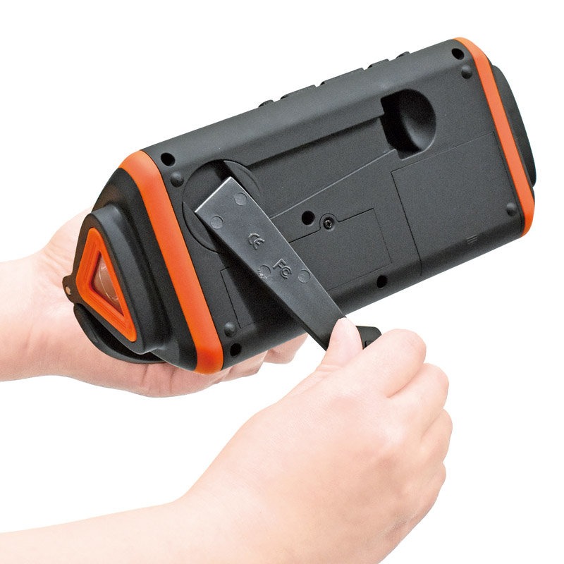 | コピー | 普段使いはもちろん、災害・緊急時の備えとして持ってて安心のチャージオ。4WAY充電の便利さ。大容量4000mAhのバッテリー内蔵。ラジオ、懐中電灯、SOSアラームと機能満載。付属ケーブルを接続しオーディオ機器のスピーカーとして使用出来ます。充電時間:USB/6~7時間、ソーラー/45~50時間(最大値の直射日光がパネルに満遍なく照射されている状態での合計時間(連続充電時間ではありません)です)、手回し/10~12時間(130~150回転/分)、乾電池/8~10時間以上(単4形3本計9本以上をご使用ください) |