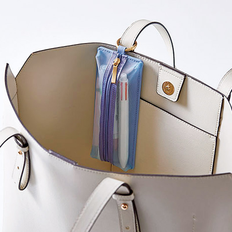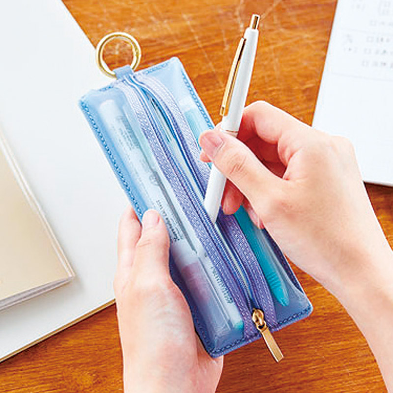 ノートや手帳と一緒に持ち運びやすいフラットなペンケース。裏面に名刺ポケット付き。