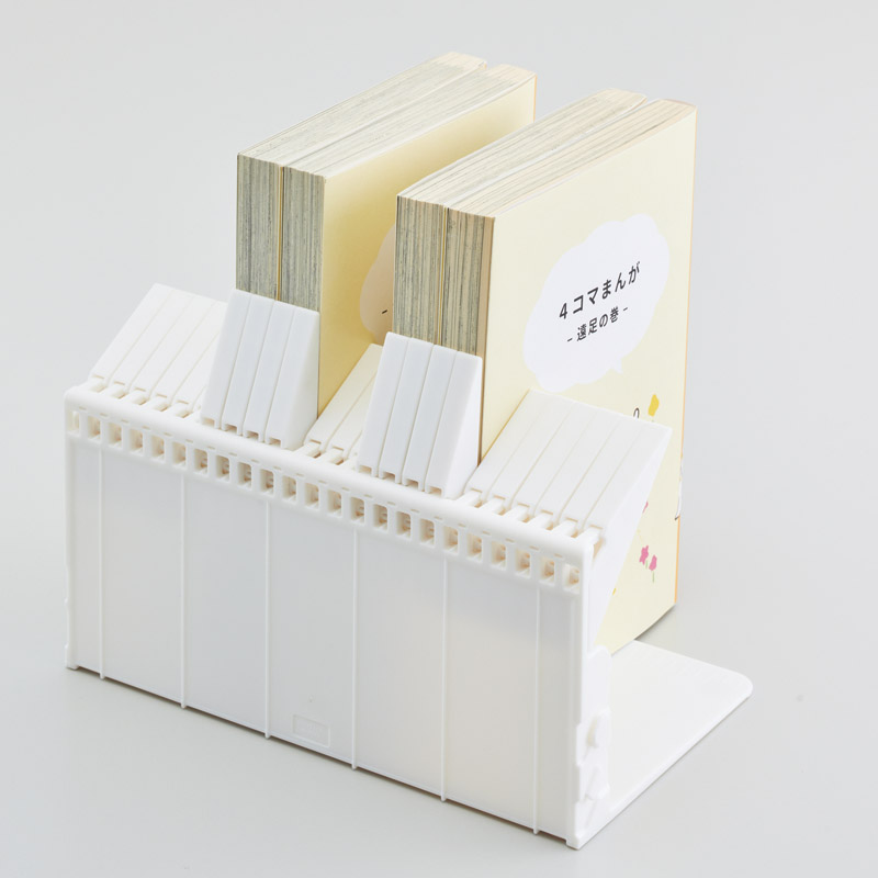 | コピー | 本を抜き取っても隣の本が倒れないブックスタンド。本以外にCD・DVDなどの整理にも。両サイドのジョイントで連結可能。本などを手前側から差し込むとストッパーが上がり、両サイドのストッパーが差し込んだものを保持するので倒れません。数冊のうち1冊だけ抜き取っても抜き取ったところのストッパーだけが下がり、隣の本が倒れないので、戻す場所が分かりやすい。うら面には滑り止めの足ゴム付き。推奨対応サイズ:文庫サイズ/約105×148㎜、新書サイズ/約103×182㎜、A5(ハードカバー)サイズ/約156×217㎜。 |