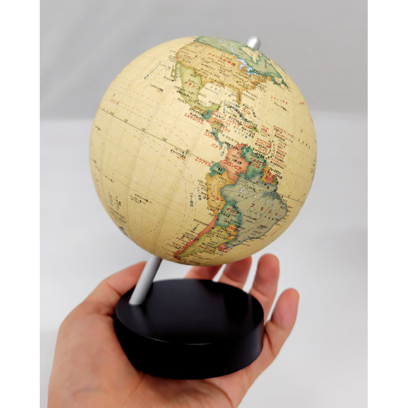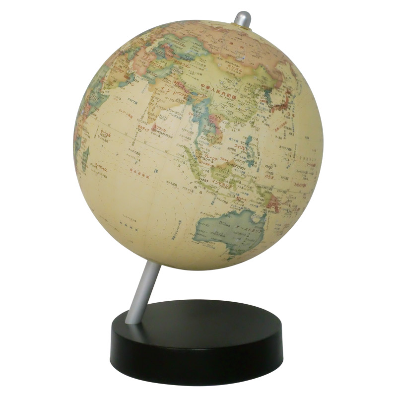 アンティークタイプの卓上型地球儀です。縮尺1億分の1の球体を自転軸1本で支持するシンプルな地球儀です。日本地図付。