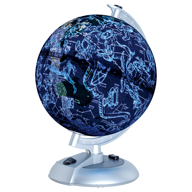 | コピー | 明るい室内では地球儀、部屋を暗くするとセンサーで光る天球儀になる1台2役の地球儀です。国別に色分けされた「行政地図」を採用し、またレリーフ併用により地形の様子も分かる本格派です。 |