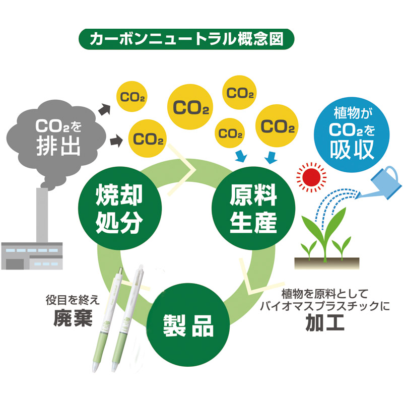 | コピー | バイオマスプラスチックとは植物由来の資源を原料にしたプラスチックです。焼却処分時にCO2(二酸化炭素)が排出されますが、原料となる植物の成長過程にてCO2を吸収するため、大気中のCO2の増加を抑えることができます。 |