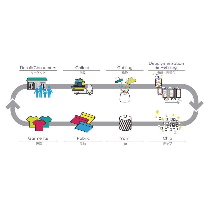 | コピー | 一般的なリサイクルポリエステルでは、選別された使用済みペットボトルを原料とし、溶かして再度糸にする手法を取ります。それに対してこのタオルに使用しているポリエステルは、使い終わった古着や工場での生産時に出た残反(生地)を原料としています。分解・再重合などといった工程を経ることで石油由来のポリエステルと比較してもクオリティが劣らないポリエステルを生産することができます。 |