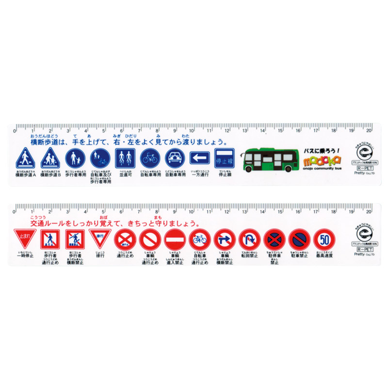 | コピー | 再生ペットとは、使用済みペットボトルをもとに生産されたポリエステル繊維。再生ペットは回収されたペットボトルを粉砕して繊維にするので、石油成分から作る必要がなく、環境にやさしい素材といえます。エコマーク認定商品。グリーン購入法適合商品。再生樹脂を100%使用したエコマーク認定の20㎝定規に、交通標識をプリントしました。 |