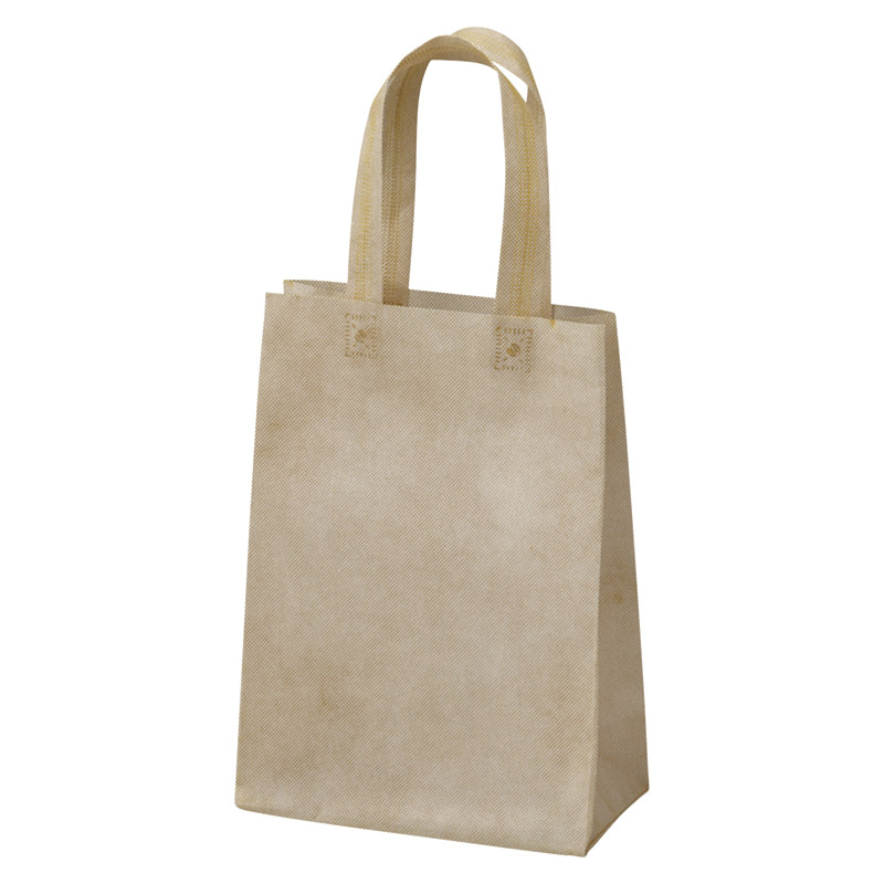 おしゃれなモカ色でマチ付きのスタイリッシュなデザインのRPET不織布バッグ。回収された使用済みペットボトルを原料(100%)として生産された生地で作られています。