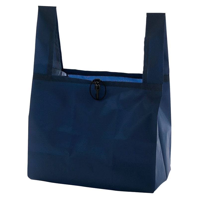 | コピー | リサイクルPET素材仕様のエコバッグ。コンビニやスーパーのお弁当が入れやすいマチ広タイプ。コンパクトにまとめられるゴムと持ち運びに便利なフック付。 |