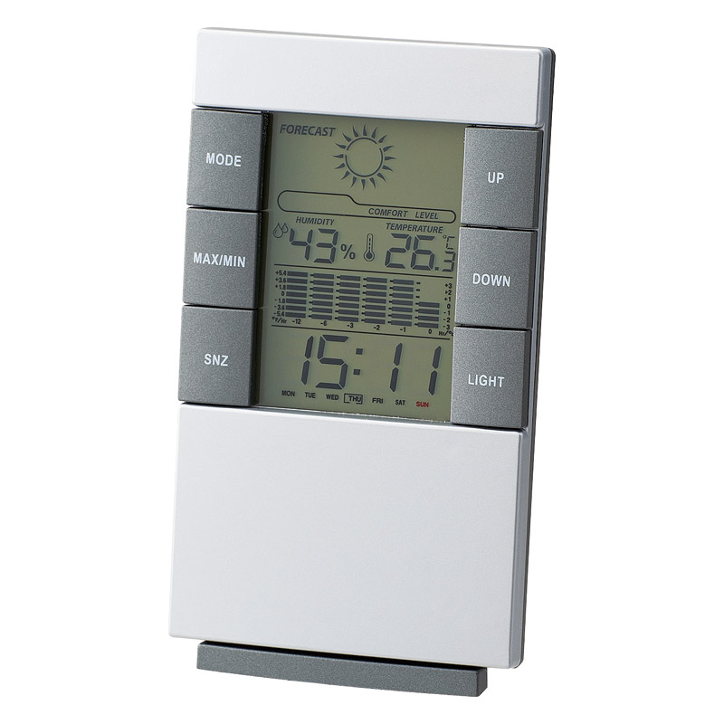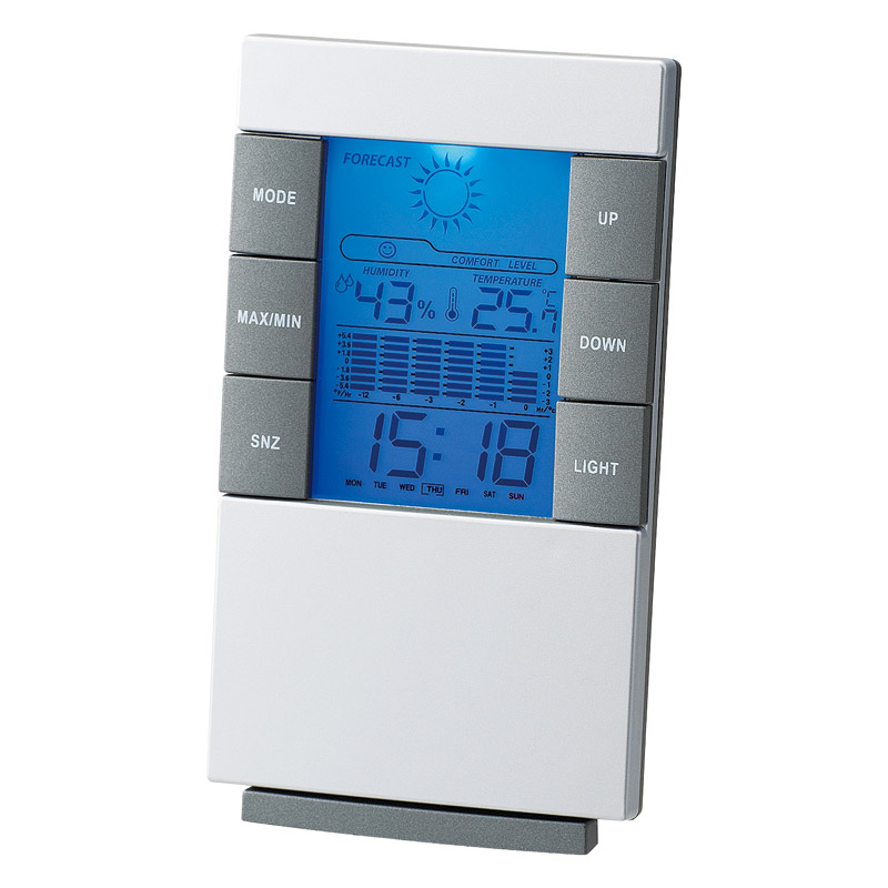 天気予報や12時間の気温の移り変わりグラフまで付いた見やすい多機能時計です。時計、アラーム、スヌーズ、温度計、湿度計、カレンダー、バックライト。