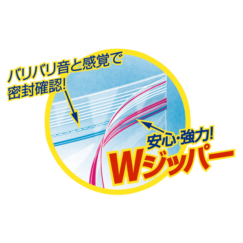 Wチャックで密封性バツグン。バリバリ音と感覚で密封確認が簡単に出来ます。レッドとブルーのカラージッパー採用。内容物や保存日が書けるメモスペース付き。