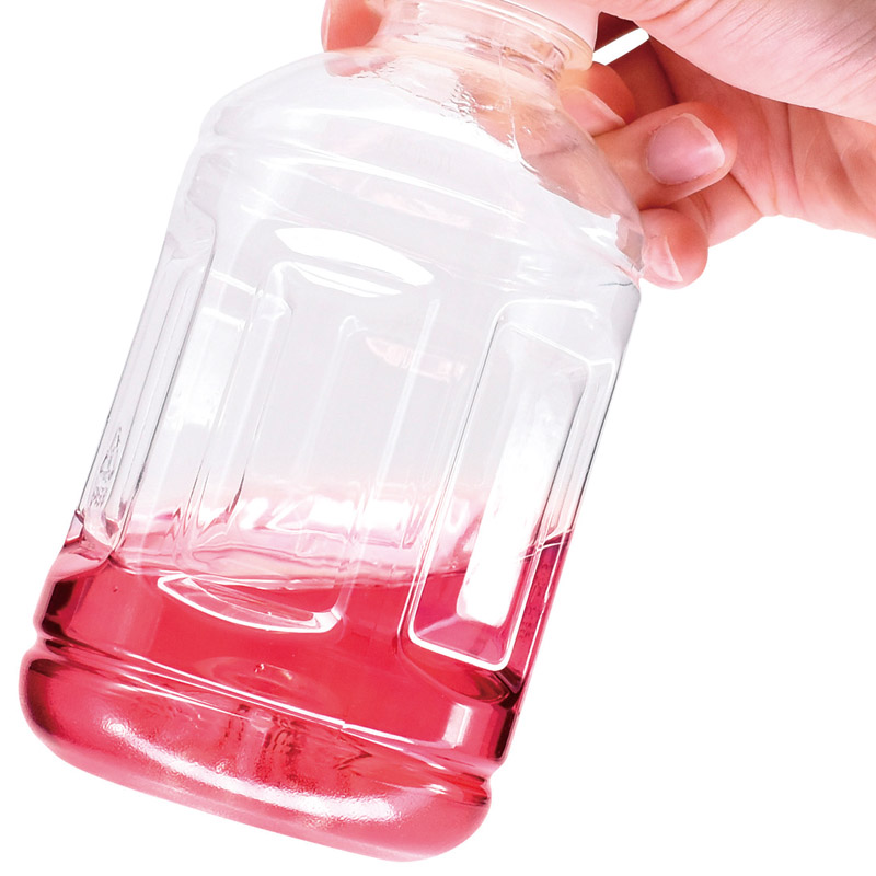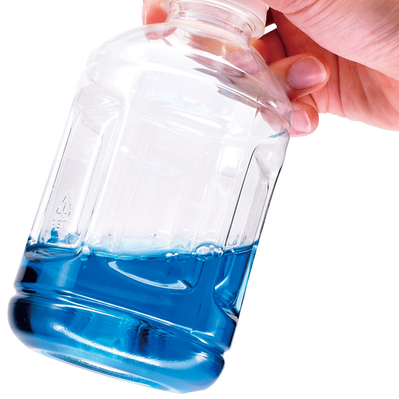 やさしく振ると赤色に、強く振ると青色に変わるふしぎな液体がつくれるよ。