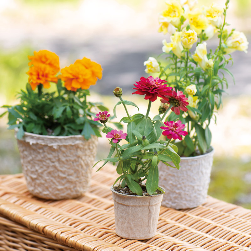 古紙を原料とした環境にやさしい植木鉢。育苗後、鉢のまま定植可能。そのまま土に埋めておくと年月をかけて分解され土に還ります。なでしこ・ヘリクリサム・アスター・矢車草のアソート。