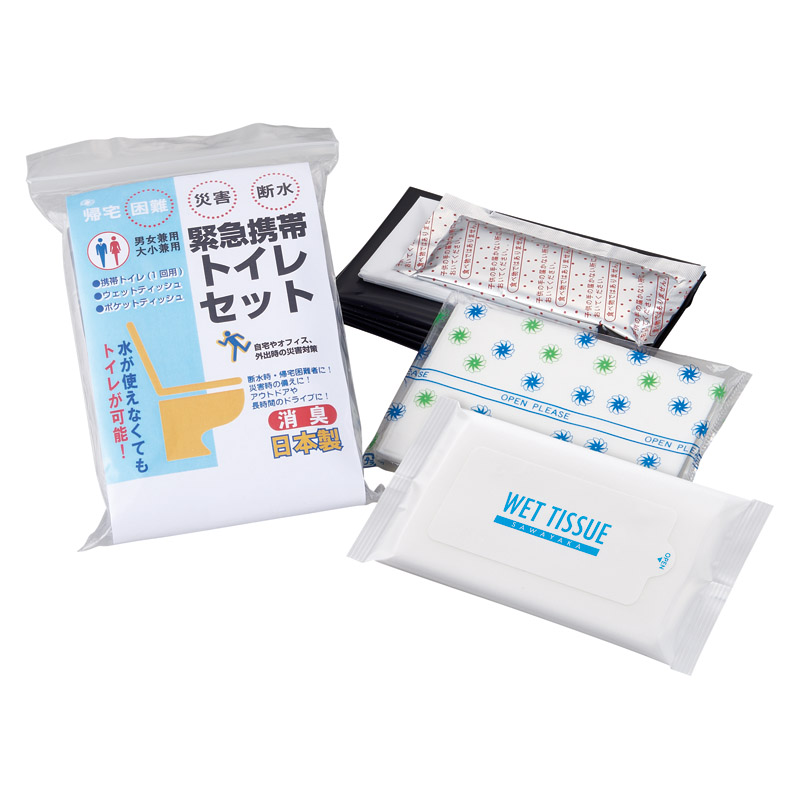 外出時の災害への備えに。携帯トイレとウェットティッシュのセットです。