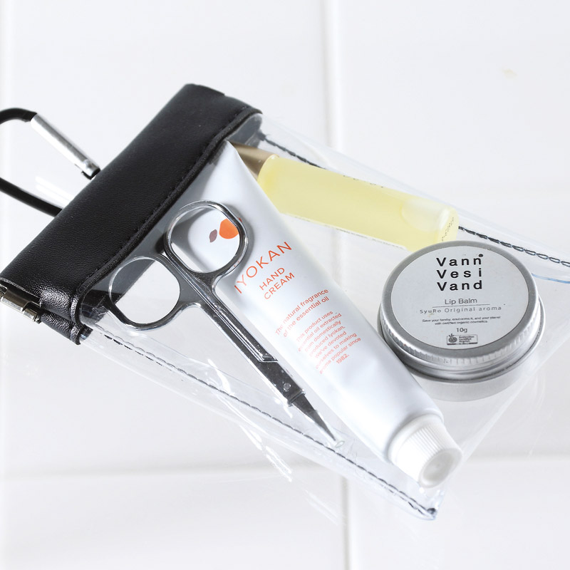 小物収納にぴったりなばねぐちタイプのクリアポーチ。カラビナ付きでバッグにさげて持ち運べます。