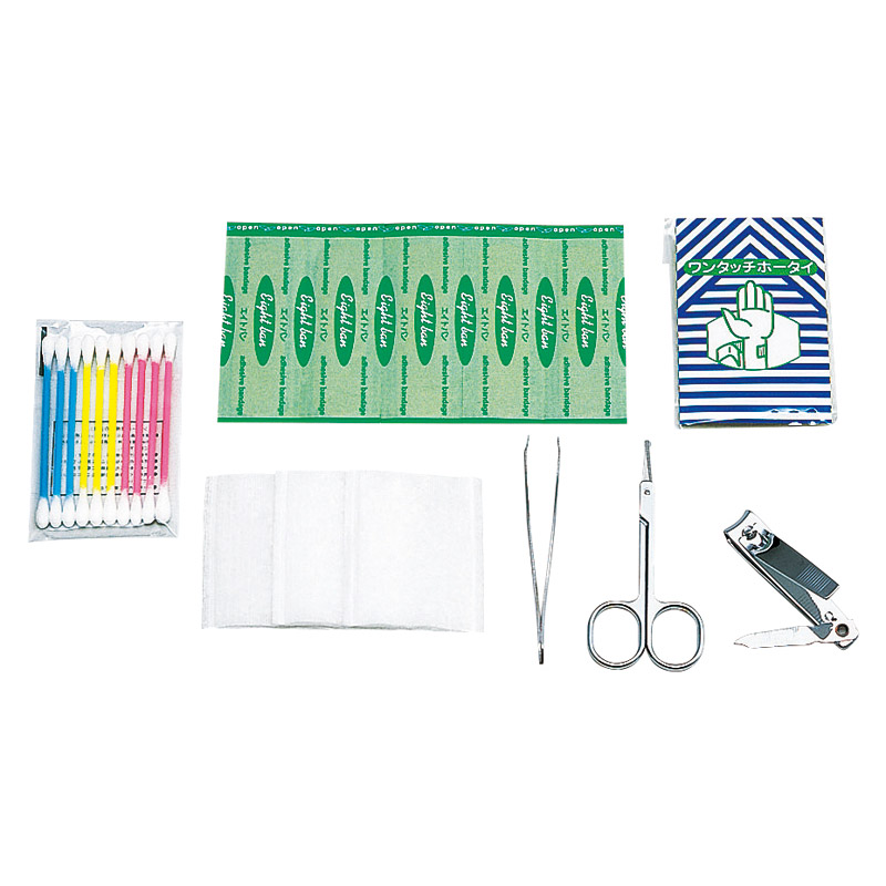 ケース(約115×76×30㎜)・エイトバン(M5枚)・カラーメンボー(10P)・コットンパフ(3枚)・ワンタッチホータイ・爪切り(やすり付き)・毛抜き・ハサミ×各1