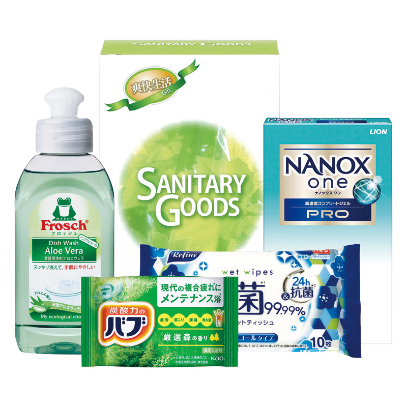 フロッシュ食器用洗剤アロエヴェラ(100ml)・花王バブ(森)・ライオンNANOXonePRO(2P)・リファインアルコール除菌ポケットウェットティッシュ(10枚)×各1