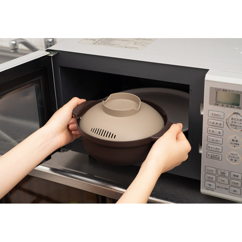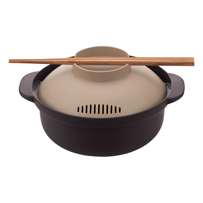 レンジで手軽に調理が出来るレンジ用コンパクトサイズのお鍋。湯切りができるので蒸し野菜調理にも便利。蓋の裏には4つのレシピの加熱時間の目安とポイントが刻印されています。食洗機使用可能。