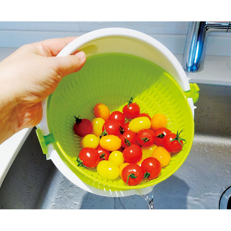 ザルとボウルが一体化。ボウルの中でザルがクルンと回転して簡単に水切りできます。ボウルをザルにかぶせて振れば、葉物野菜などの水切りにも便利です。麺・パスタの湯切りもできます。耐熱温度:120度。