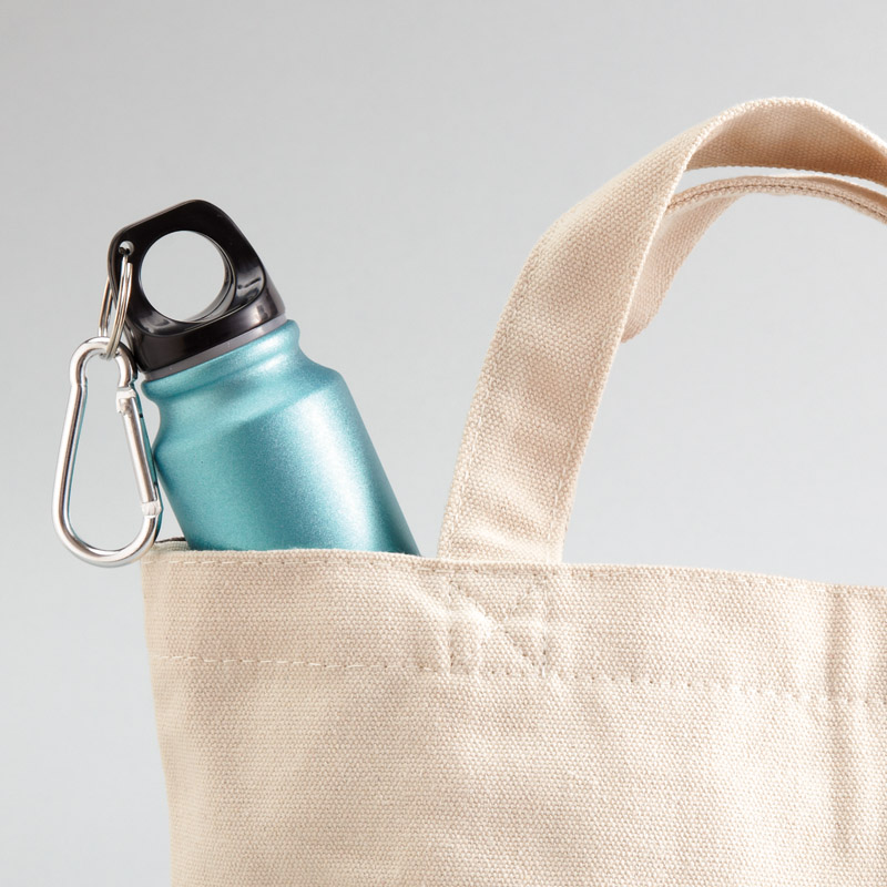 カバンの中で場所を取らないスリムなアルミボトル。携帯に便利なカラビナ付き。