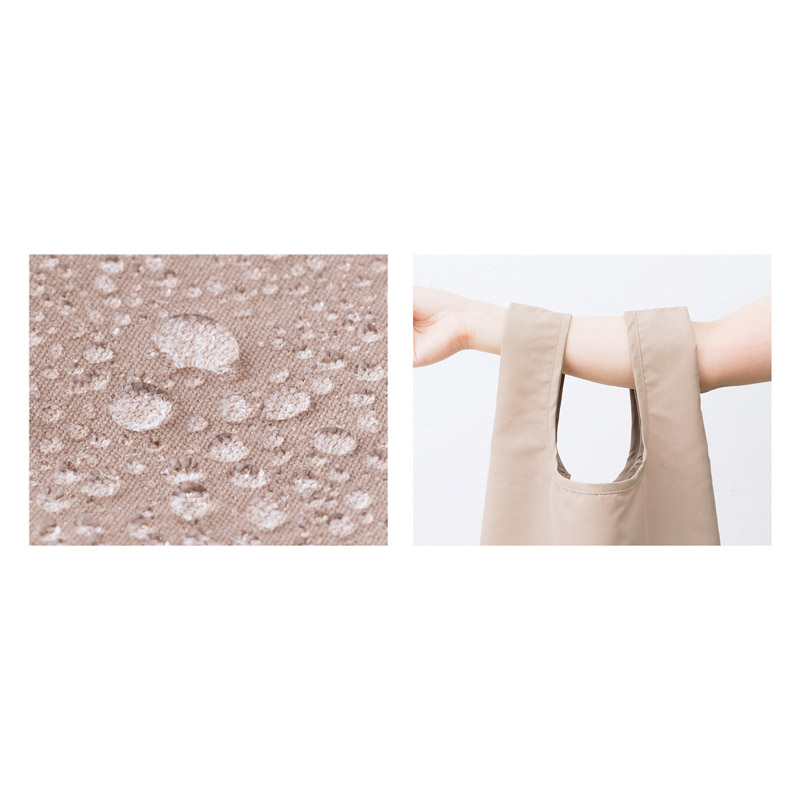 | コピー | コットンの肌触りとポリエステルの機能性を兼備した上質素材。汚れを弾く撥水加工+水洗いできる素材で、毎日のお買い物に最適です。内ゴムでコンパクトに収納できます。 |