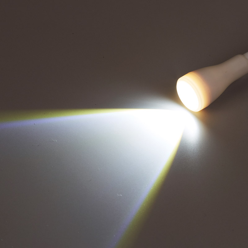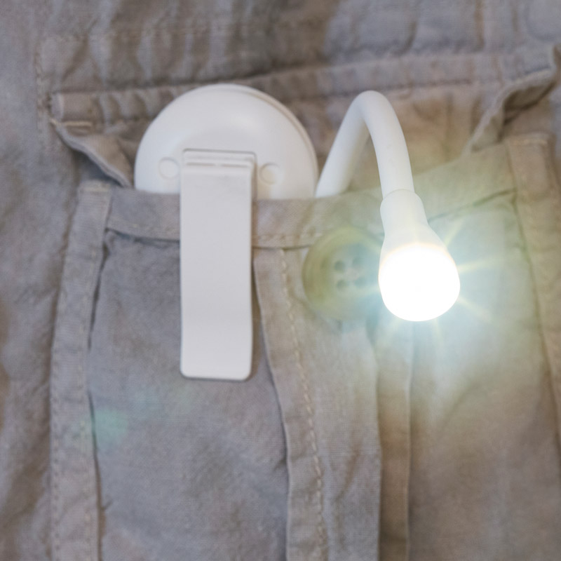 フレキシブルアームで角度調整可能。便利なクリップタイプで両手が使えるので暗所の作業・非常時にも重宝。電池1本で使える軽量タイプ。