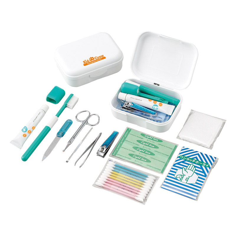 | 内容 | 専用ケース(約80×110×40㎜)・爪切り・エチケットハサミ・耳かき・毛抜き兼ピンセット・爪ヤスリ・ワンタッチ包帯・ハブラシ(カバー付)・ハミガキ粉・コットンパフ(3枚)・キズテープ(M3枚)・カラー綿棒(10本)×各1 |