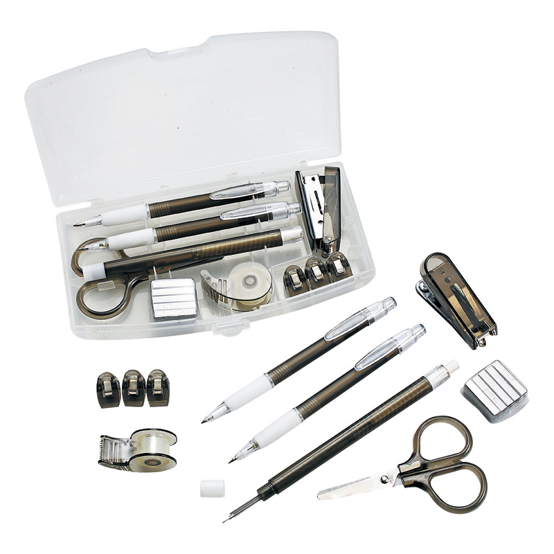 | 内容 | クリアケース(約100×185×22㎜)・ボールペン・シャープペンシル・消しゴム&シャープ芯ケース(シャープ替芯入)・ステープラー・ハサミ・セロテープカッター×各1、クリップ×3、ステープラー替芯×5 |