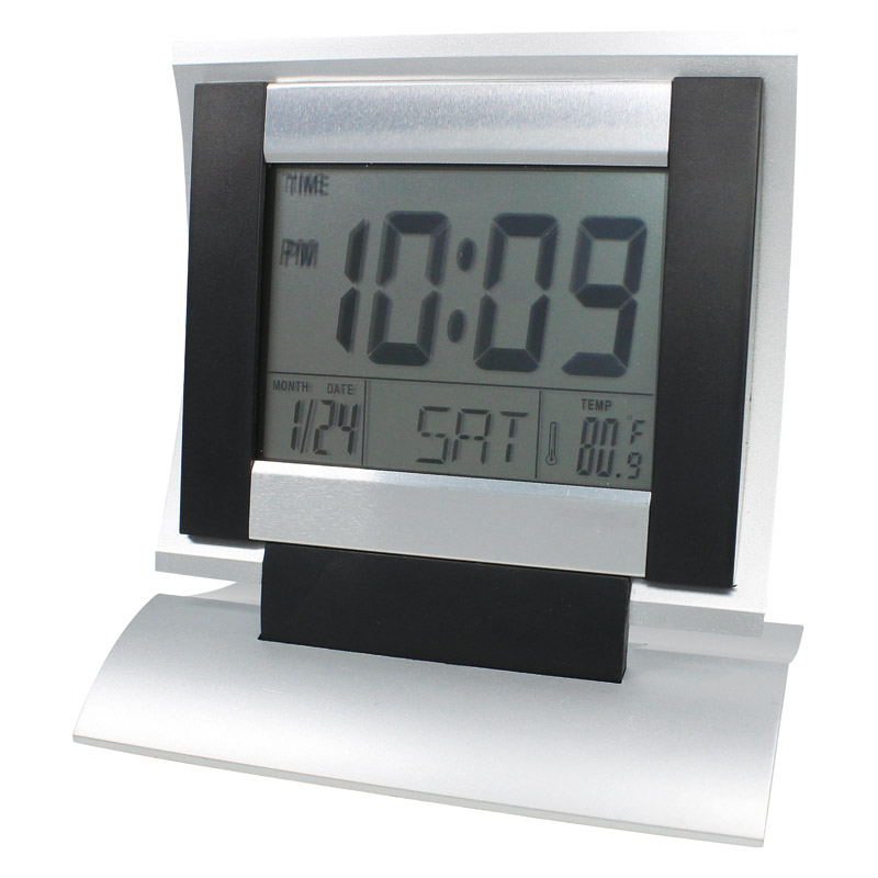 折り畳みタイプで大きな液晶ディスプレイと角度調整ができるデジタルクロックです。カレンダー、時計、アラーム、温度計。
